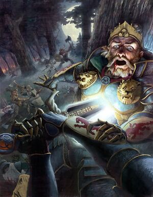 After the battle, Cambruin raced through the forest, chasing the fleeing remnants of the Elvish host. Sir Gerriant the Old was also with them, as was that Other whose deeds have blotted out his name. Gerriant had come to doubt The Traitor's intentions, though the High King had never feared one of his own might betray him. Thus the Traitor led the two down forest paths pre-arranged, to a glade before an ancient oak tree. There an Elvish assassin lay in wait, armed with arrows enchanted for death and ruin. But Gerriant saw the archer even as he took aim, and threw himself at the High King, shoving him aside. Thus did Sir Gerriant take the arrow meant for his liege, and the chill of Death grasped his heart. Cambruin, knocked off balance by his loyal servant, dropped Shadowbane to the ground, and the Traitor saw his opportunity. He took up Shadowbane, the Sword of Destiny, and stabbed Cambruin through the heart. So mighty was his traitorous stroke that blade pierced backplate, man, and breastplate besides. The High King was driven back and pinned to the mighty tree, and his heart's blood ran out upon it and seeped into the ground. So Cambruin died, betrayed, and Shadowbane's curse was fulfilled once again.