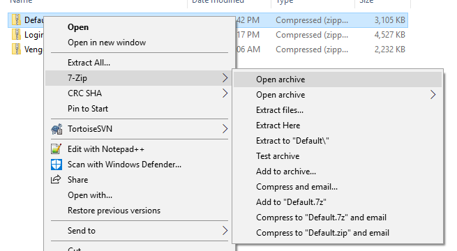 3. In the Skins directory, right-click on the compressed folder you want to edit and open the archive (7-Zip works well for this). Do not Extract the folder! Extracting and Re-zipping does not work for whatever insane reason. You need to edit the files directly in the compressed folder.