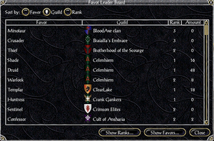Guild masters may choose to erect a shrine to a particular creed associated with a race and/or class by purchasing the necessary building deed from a builder (See the Shrines article). A city may have a maximum of three shrines, no two of which can be the same. The city who has the most favor with their creed may receive the best boon. In order to receive boons, the shrine requires a hireling called a Votary, purchasable from a steward.