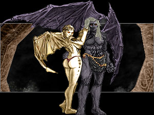 Tall and graceful, the Nephilim are obviously kin to Humanity. Their skin ranges from green to deep blue, and the Nephilim might be the most beautiful of all the Manlike races if not for some disturbing differences. Parts of their bodies are covered in serpent-like scales, and cruel horns sprout from their brows. Most shocking of all, batlike wings sprout from the shoulders of every Nephilim, letting the Tainted Ones fly like the Aracoix do. Nephilim are renowned for their strange beauty, their cruelty, and their aptitude with magic.